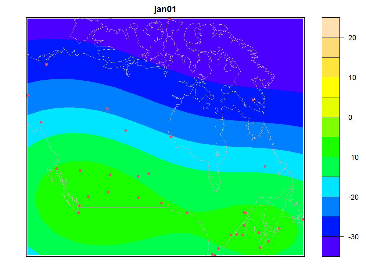 カナダの35観測地点における365日の日平均気温が,fdaパッケージのCanadianWeatherとして提供されている.観測地点の位置情報を用いた基底数2の非負値行列因子分解を適用することで,観測されていない地点における365日の気温を予測し,GIFアニメーションとして示す.画像クリックでアニメが開始.