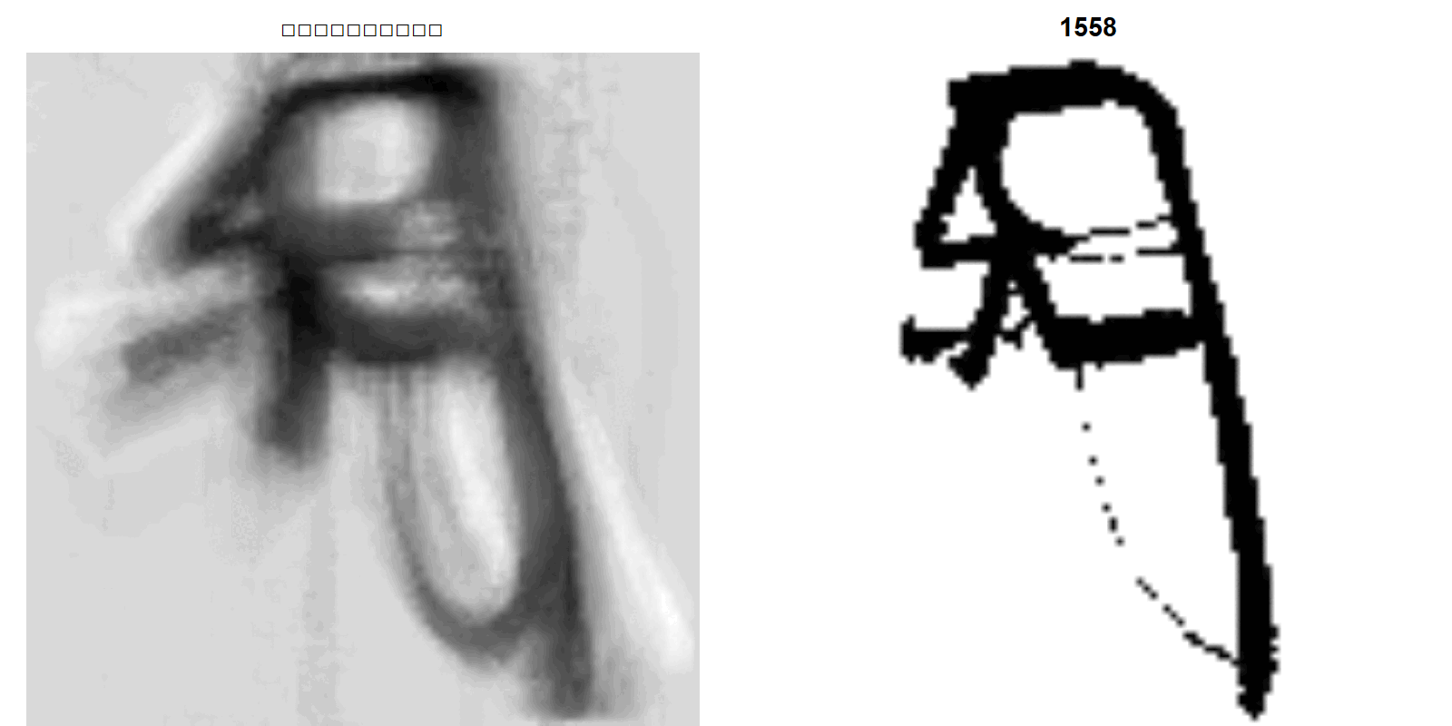 東京大学史料編纂所の花押データベースから,北条氏政の1558年から1588年までの31年間96枚の花押画像を用いて基底数を3とする非負値行列因子分解を適用した.左に5つの基底画像によって近似・平滑化された花押を,右に元の花押画像をGIFアニメーションとして示す.画像クリックでアニメが開始.初期において幅広だった花押が徐々に傾いていく様子が分かる.