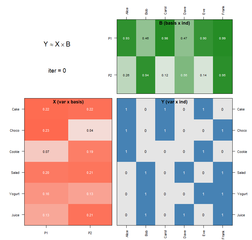 非負値行列因子分解(NMF)は,非負の観測行列Yを2つの非負行列の積Y≈X×Bに分解する手法である.6人の食品購入データ(Y)を基底数2で分解する例を示す.乗法更新則により行列XとBが反復的に更新され,XBがYに近づいていく過程をアニメーションで示した.Rパッケージnmfkcとして実装されている.画像クリックでアニメが開始.