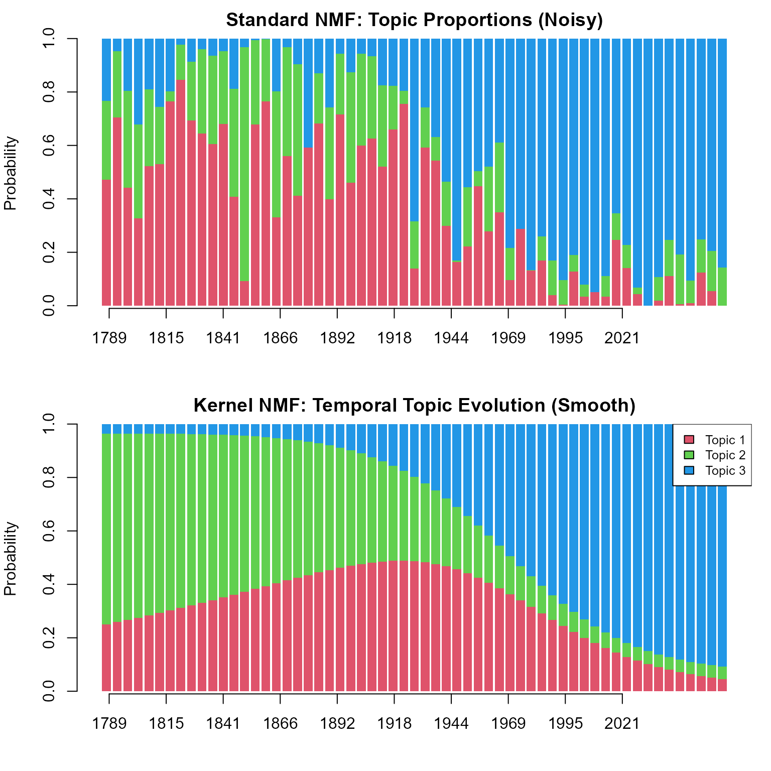 main = "Kernel NMF: Temporal Topic Evolution (Smooth)", ylab = "Probability")
